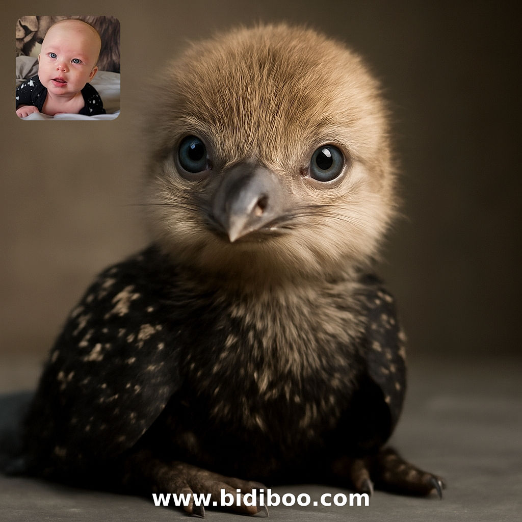 • A close-up of an adorable baby with bright blue eyes and a slightly open mouth, lying on a soft surface with a cozy background featuring a blurred animal print. The baby wears a black outfit with white splatters, creating a charming and heartwarming portrait.