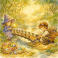 Their clumsy march filled with giggles reached the edge of the Topsy-Turvy Jungle just as the sun dipped low, coloring the sky in hues that resonated with Louie’s heart—a blend of orange zest, pink bubblegum, and mischievous blue.